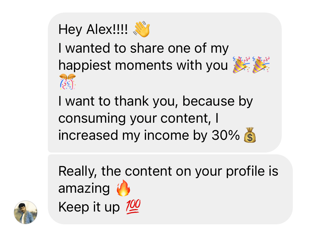 Alex's help changed everything for me. My confidence is on a whole new level, I don't fear tough conversations anymore, and I’ve been crushing it at work (promoted twice in less than two years)!